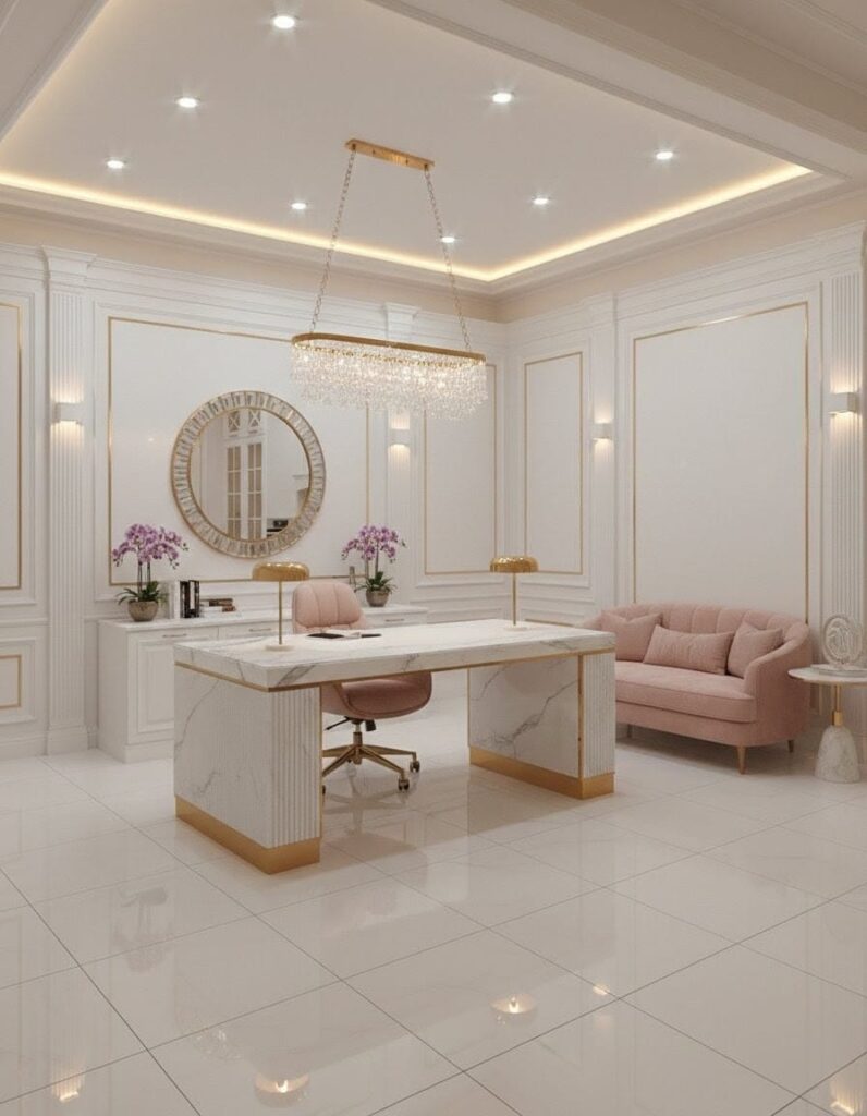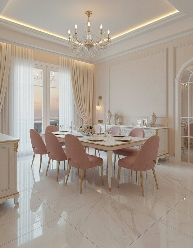 White serves as the base color, creating a clean, classy feel, while soft pink furniture adds warmth and beauty. Gold accents like mirrors, lights, and decor make the space look rich without being too much.