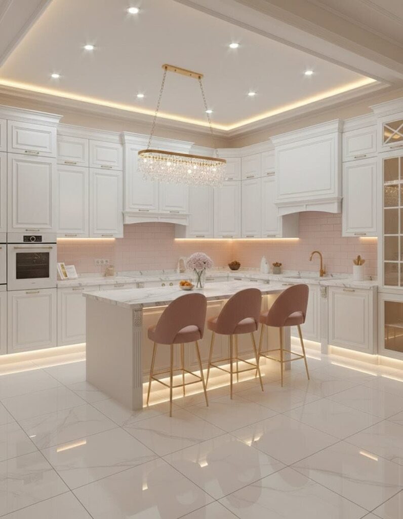 This modern kitchen combines the clean elegance of a white theme kitchen with the soft charm of a pink theme kitchen. It features all-white cabinetry with classic moldings, complemented by a pink tiled backsplash and white marble countertops.