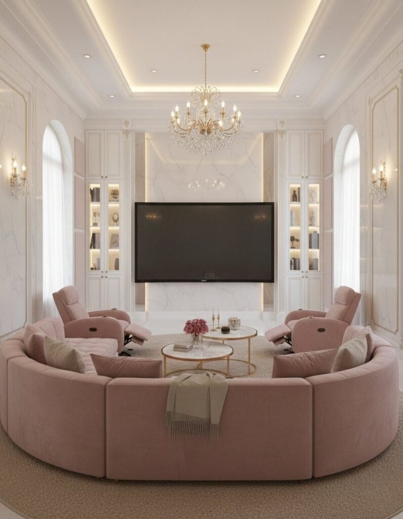 This cozy entertainment room features a round pink sectional sofa facing a big wall-mounted TV. The TV sits on a backlit marble wall, with built-in white bookshelves on each side that have soft lighting. Two matching pink recliners and a soft, neutral-colored circular rug complete the space, making it comfortable and stylish.