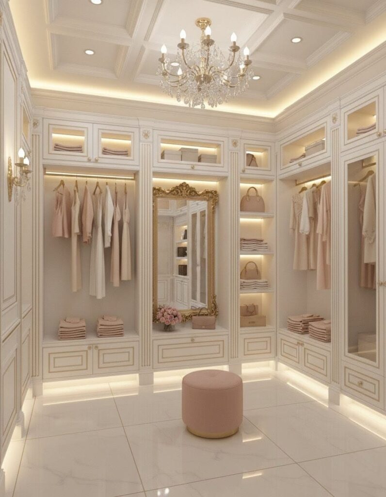 Everyone needs a dream closet, a special place where everything is organized and beautiful. This walk-in closet features custom white cabinets with gold details and built-in lighting to showcase your clothes and bags. A gold-framed mirror is built into the wardrobe, and a soft pink velvet ottoman provides a comfy spot to sit while you get ready.